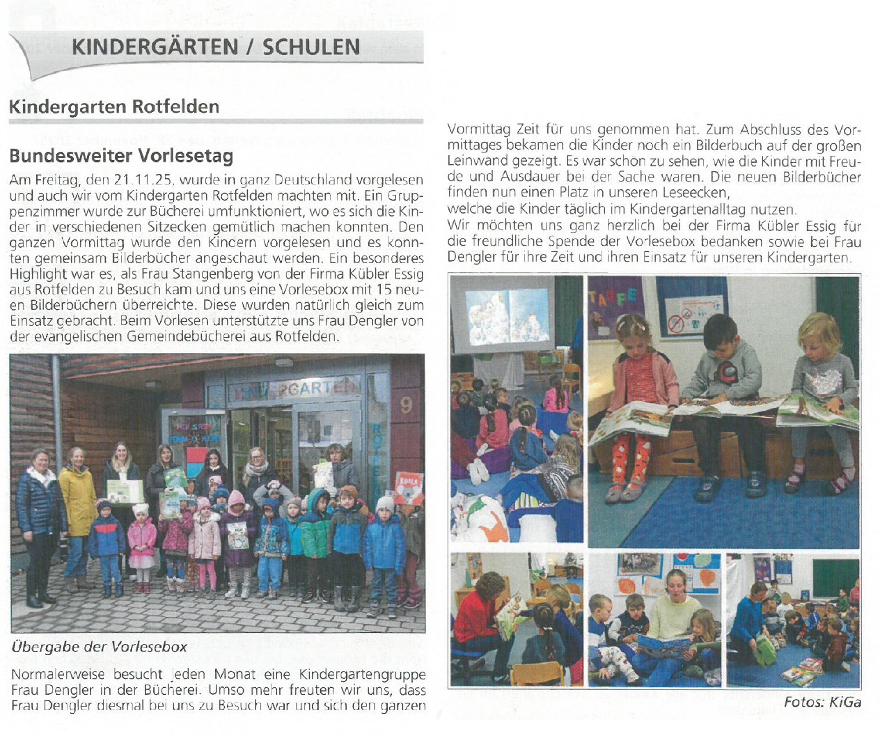 Tag des Lesens – KÜBLER ESSIG unterstützt den Kindergarten Rotfelden 📚 Anlässlich des Tags des Lesens freut sich KÜBLER ESSIG, den Kindergarten Rotfelden mit einer Spendenbuchbox zu unterstützen. Wir wünschen allen Kindern und Erzieher*innen viel Freude beim Lesen und Entdecken!