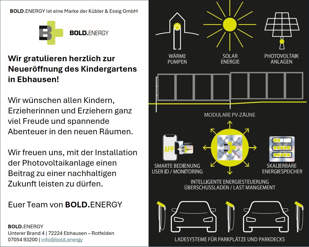 Am Samstag, den 27.09.2025, wurde der renovierte Kindergarten in Ebhausen feierlich eröffnet. Wir freuen uns sehr, Teil dieses Projekts zu sein und mit unserer Arbeit einen Beitrag zur nachhaltigen Zukunft der Kinder leisten zu dürfen. Im Zuge der Renovierung haben wir am Kindergarten eine leistungsstarke Photovoltaikanlage installiert, die künftig umweltfreundlichen Strom produziert und so nicht nur die Energiekosten senkt, sondern auch ein starkes Zeichen für erneuerbare Energien setzt. ☀️⚡ Wir wünschen den Kindern, Eltern und Erzieher:innen viel Freude im neuen Kindergarten – mit noch mehr Platz, Licht und nun auch Sonnenenergie! 🌱
